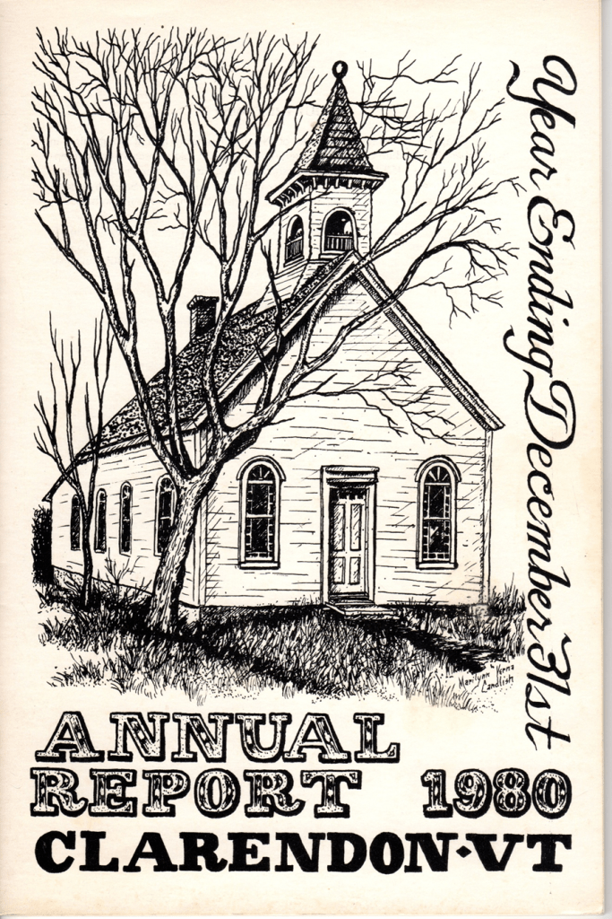 One of my first priorities is to read as much as possible about the history of the North Clarendon Chapel. The Historical Society of Clarendon has an abundance of photos and documents on their website that illuminate the town’s history. The church history section includes several entries about the chapel’s history. In 2017, Joan Bixby posted to the society’s website the cover of the 1980 town report along with a short history of the chapel that appeared in the report. The cover features a drawing of the chapel by Marilyn Verna Candish (copied below). I asked historical society president Bob Underhill if he remembers Marilyn Verna Candish. He does not, but perhaps other people in the Clarendon area do recall her.
